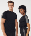 100% polyester. Single jersey.Wicking finish keeps you dry and comfortable.Raglan sleeves.Taped neck.Contrast back collar, shoulder and sleeve panels.Twin needle cuffs and hem.Tear out label.